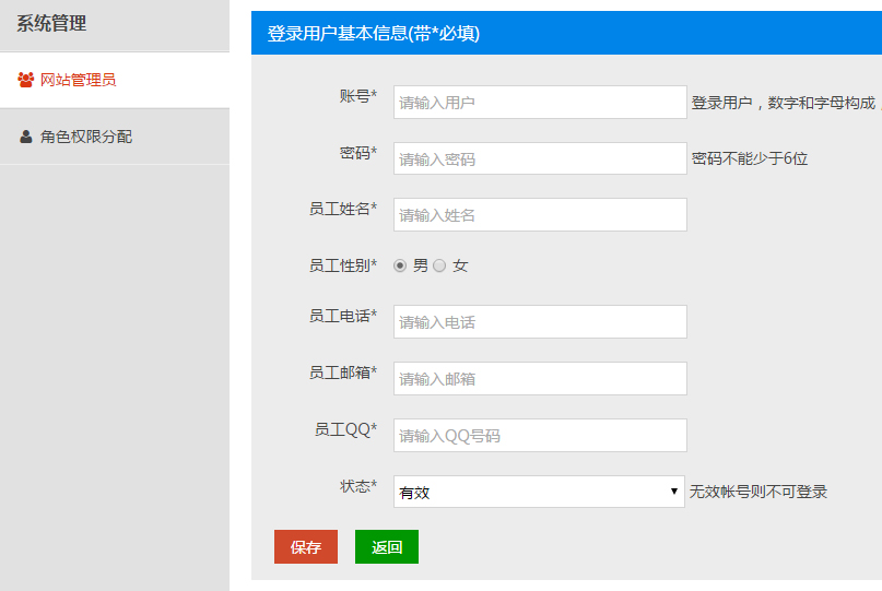 注:增加网站管理员之前,需要先增加管理员角色,分配不同角色管理网站不同的内容。